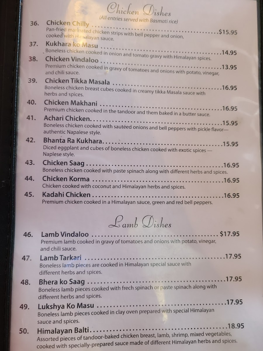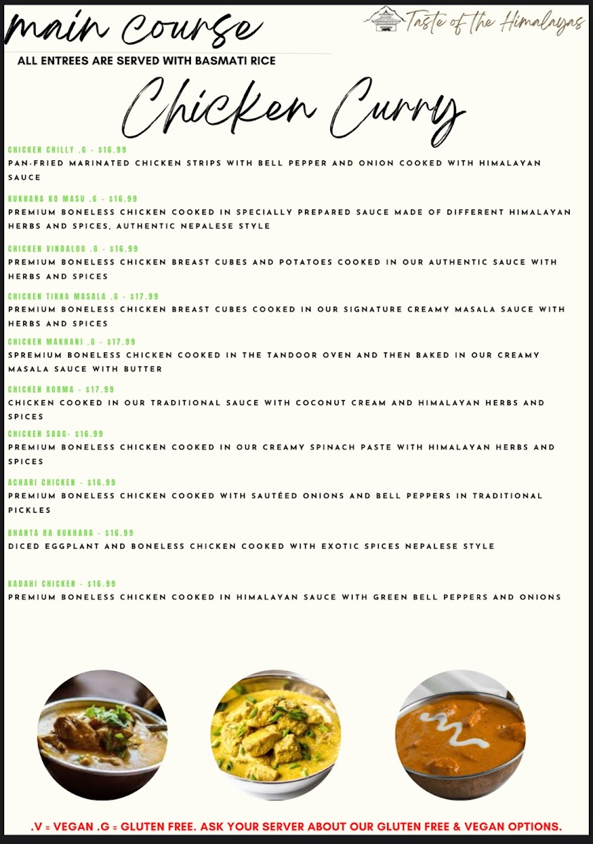 The Taste Of The Himalayas Menu showcases a variety of dishes that are perfect for sharing with friends or enjoying on your own. Each dish is crafted with authentic spices and ingredients that reflect the rich culture and history of the Himalayan region. Whether you’re a fan of the fiery heat of spicy curries or prefer something more mild, you'll find a dish that hits the spot. Their vibrant selection is balanced perfectly, allowing each flavor to stand out, making each bite a memorable experience.